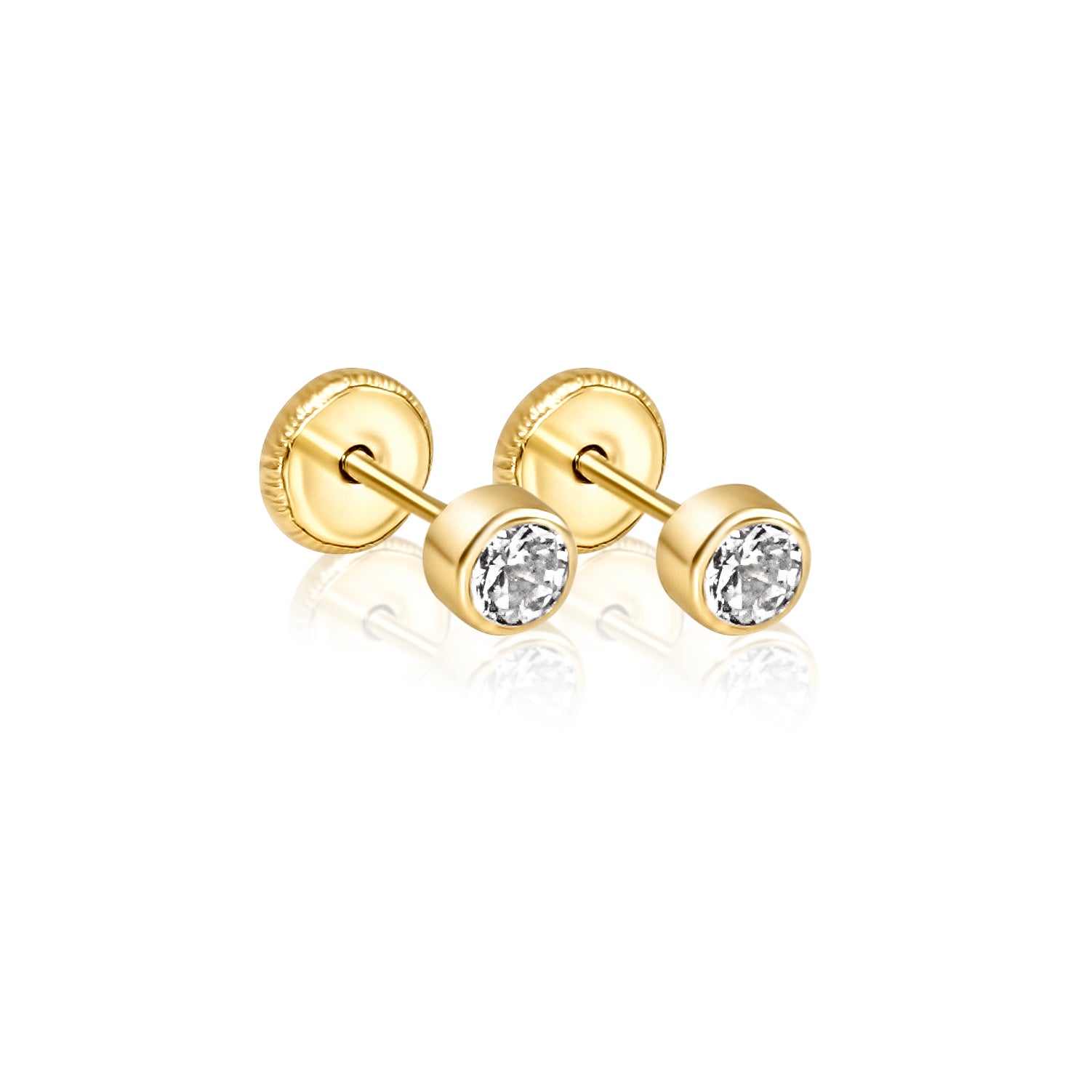 3mm Bezel Round Cubic Zirconia crafted in 14k gold. Designed for little ears with secure screwbacksavailable in Korean and Spanish styles. A perfect gift for birthdays, baby showers, and special milestones.
