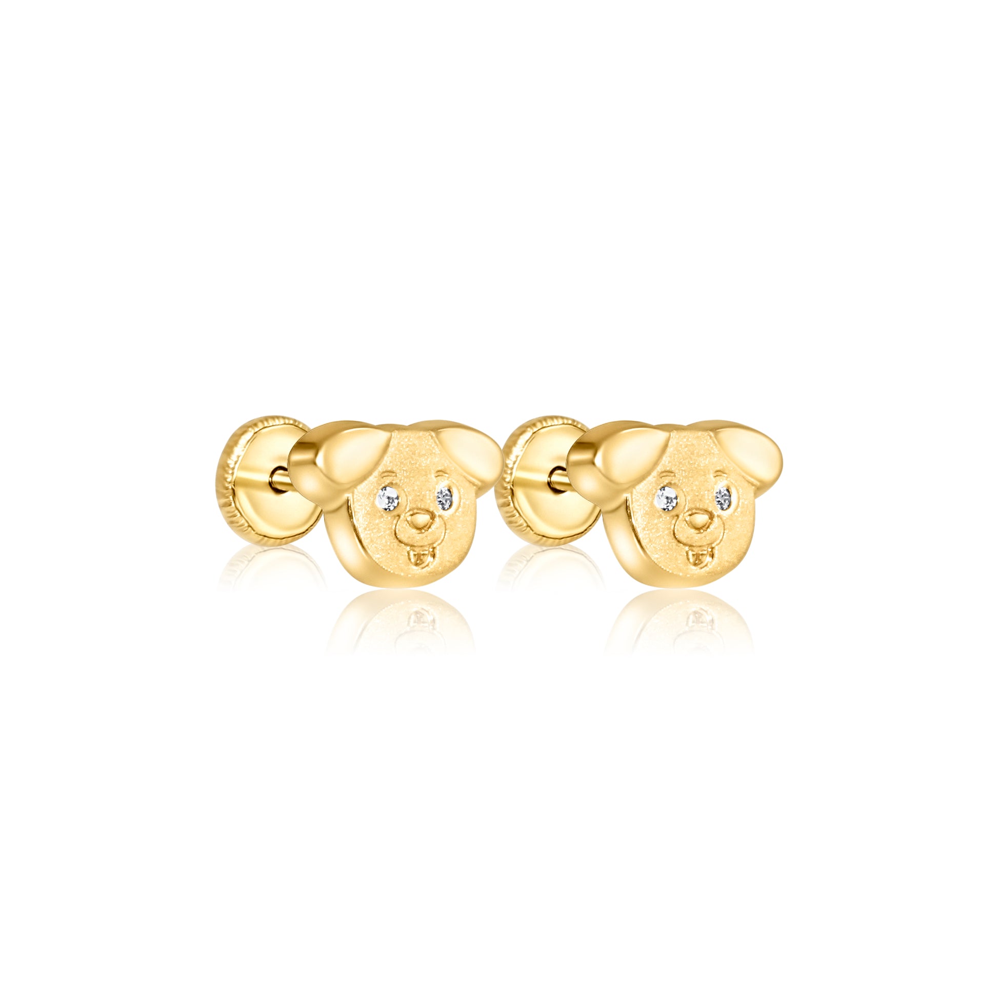 Dog crafted in 14k gold. Designed for little ears with secure screwbacksavailable in Korean and Spanish styles. A perfect gift for birthdays, baby showers, and special milestones.